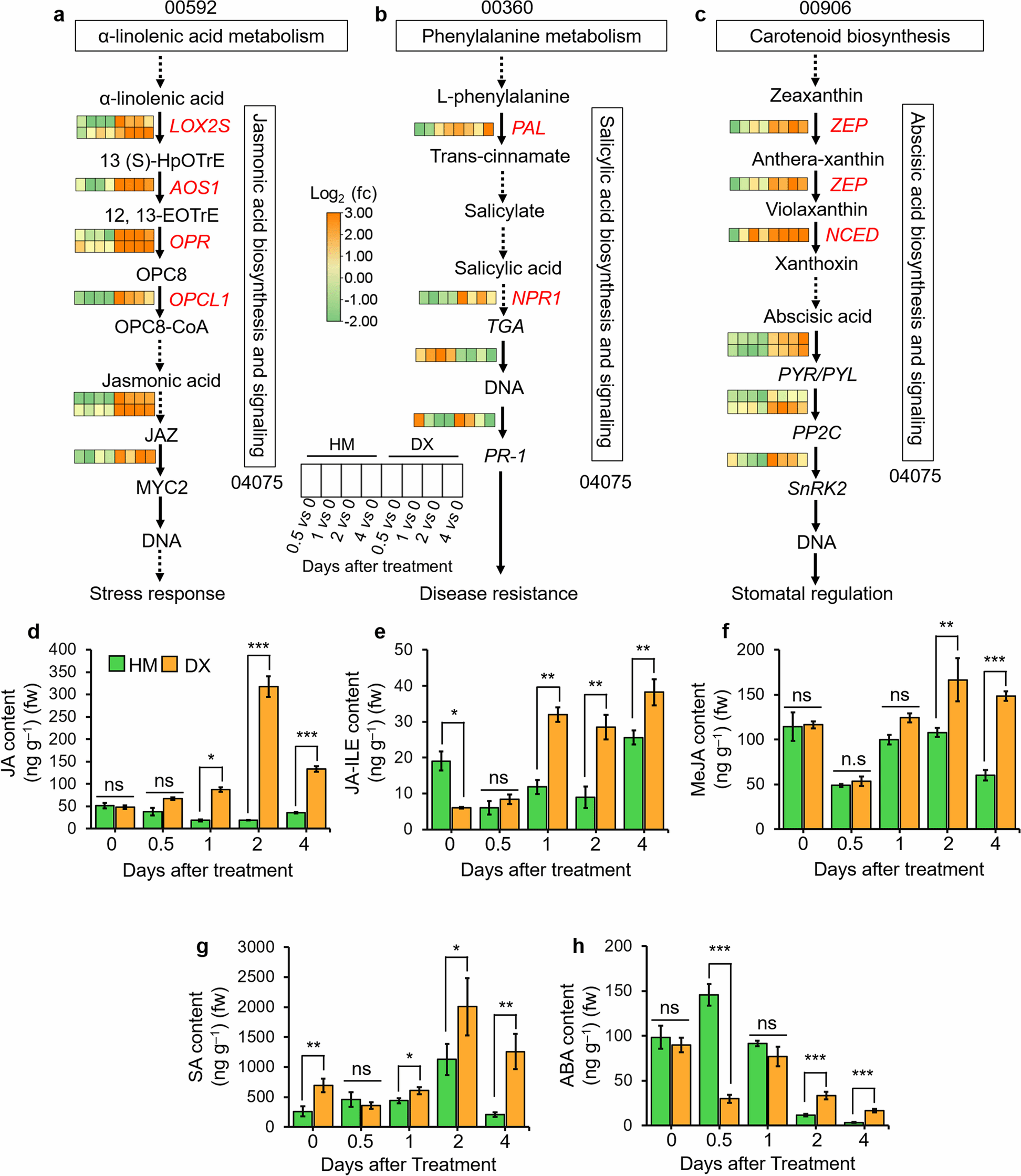图3 涝害胁迫下‘湖景蜜露’(HM)和‘东溪小仙’(DX)叶片中激素的转录和代谢响应