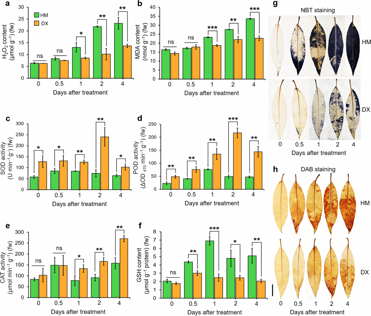 图1 涝害胁迫下‘湖景蜜露’(HM)和‘东溪小仙’(DX)叶片中ROS积累及相关抗氧化活性