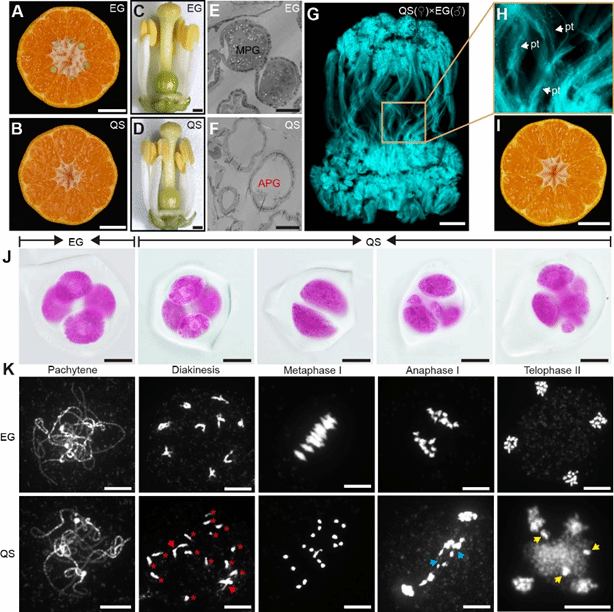 该研究以有核椪柑品种(EG)为对照,发现体细胞突变品种无核椪柑(QS)花器官形态正常,但成熟花粉无活力,果实无核;用有活力的EG花粉对QS授粉后果实仍无核,表明QS雌雄均不育(图1)。为确定QS雌雄不育原因,首先观察减数分裂产物四分体,发现QS中出现大量异常多分体(81.67%)(图1J);进而观察减数分裂不同阶段染色体行为,发现QS从终变期开始发生异常,染色体交叉(CO)数量显著减少,产生大量单价体,随后出现不均等分离、落后染色体等异常现象(图1K)。以上结果表明,减数分裂异常是QS雌雄不育的原因。
