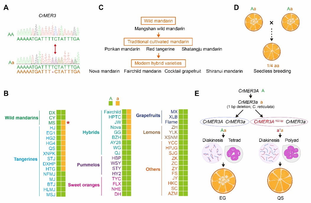 为验证CrMER3基因功能,对短童期柑橘模式植物山金柑(F. hindsii)MER3基因进行编辑,获得的纯合编辑植株表型均与QS一致,表现为花器官发育正常,花粉无育性,减数分裂紊乱,产生异常四分体。在柑橘种质资源中检测CrMER3基因型,发现功能缺失的CrMER3a等位基因可能起源于原始的野生橘—‘莽山野橘’;随后通过驯化传递到传统的栽培橘,如椪柑、红橘和砂糖橘等;再通过杂交途径分布到现代柑橘栽培品种,如鸡尾葡萄柚、‘不知火’橘橙等杂柑(图2)。根据CrMER3a变异位点,团队设计并开发了KASP标记,验证了其在不同柑橘类型中的有效性,为柑橘无核育种亲本选配及杂种后代早期筛选提供了快速高效且低成本的分子标记,并已创制一批潜在无核新种质。这是国际上柑橘核不育细胞与分子机理解析、无核标记开发并用于育种的首例报道,为柑橘无核种质创制与新品种培育提供了一条新途径。