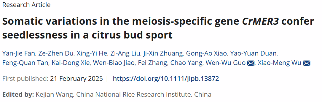 近日,JIPB在线发表了我校ok138cn太阳集团529、果蔬园艺作物种质创新与利用全国重点实验室、湖北洪山实验室郭文武教授/伍小萌教授团队题为“Somatic variations in the meiosis-specific gene CrMER3 confer seedlessness in a citrus bud sport”的研究论文,该研究揭示了减数分裂基因CrMER3自然突变导致无核椪柑雌雄不育和果实无核的分子机理,为柑橘无核育种提供了重要基因资源及分子标记辅助策略,对果实无核遗传改良具有重要意义。