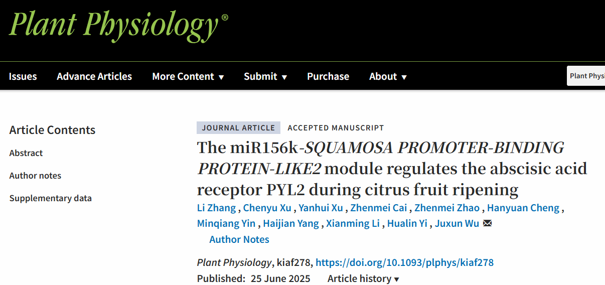 近日,ok138cn太阳集团果蔬园艺作物种质创新与利用全国重点实验室伊华林/吴巨勋课题组在Plant Physiology发表了 “The miR156k-SQUAMOSA PROMOTER-BINDING PROTEIN-LIKE2 module regulates the abscisic acid receptor PYL2 during citrus fruit ripening”的研究论文,揭示了csi-miR156k通过靶向SPL2促进柑橘果实成熟的功能和分子机制。