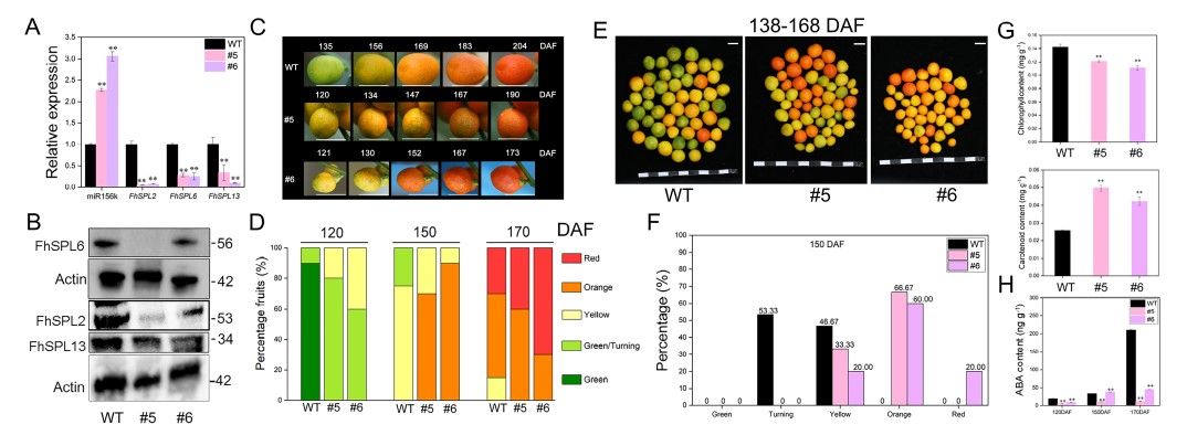 伊华林/吴巨勋课题组始终专注于柑橘果实重要性状形成的调控机制研究,其中柑橘果实熟期性状形成是重点研究方向。在前期研究中,本课题组基于晚熟脐橙芽变材料,通过小RNA组鉴定出了一个差异表达的csi-miR156k (Wu et al., 2016)。在山金柑中超量表达csi-miR156k可使果实早熟23.5-36.65天(图1),通过瞬时转化山金柑果实证明SPL2能显著调控果实的成熟,证明其是csi-miR156k发挥调控柑橘果实成熟功能的关键靶基因。为了解析其中的分子机制,基于DNA亲和纯化测序(DAP-seq)筛选到SPL2的关键候选靶基因——ABA信号转导途径的关键基因PYL2,采用双荧光素酶实验、酵母单杂、EMSA实验证实了SPL2可直接结合PYL2的启动子并抑制其启动子活性。在山金柑中瞬时沉默PYL2和瞬时超表PYL2则获得了与SPL2相反的表型。为了进一步解析SPL2抑制PYL2转录表达的机制,通过酵母库筛选,鉴定到了与SPL2可能存在互作的蛋白CCoAOMT7,并通过酵母双杂、LCI、BIFC、Co-IP与His-Pulldown证实了SPL2与CCoAOMT7的蛋白互作关系,并发现该复合体通过招募SAHH1蛋白提高了PYL2启动子区的DNA和组蛋白甲基化水平,从而共抑制PYL2的转录,进而通过影响ABA信号转导参与柑橘果实成熟调控(图2)。