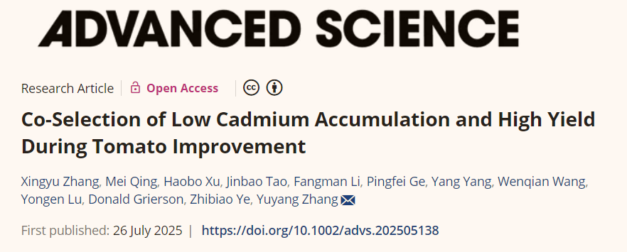 近日,ok138cn太阳集团529、果蔬园艺作物种质创新与利用全国重点实验室/湖北洪山实验室番茄研究团队在国际期刊Advanced Science发表了题为Co-Selection of Low Cadmium Accumulation and High Yield During Tomato Improvement的研究论文,揭示了番茄在改良进程中如何“一举两得”——同步提高产量并降低Cd积累。文章指出,这一看似偶然的“双赢”,实则源于基因组上的一段“遗传搭车”效应。