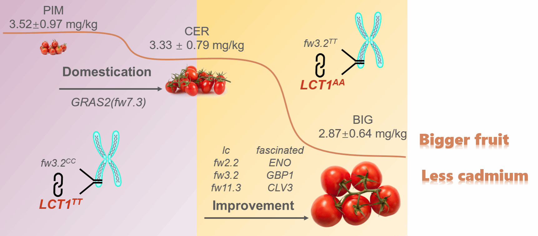 进一步研究发现,“低Cd”等位基因LCT1A与“大果”等位基因fw3.2T紧密连锁。回溯番茄的驯化改良历程,从野生番茄到樱桃番茄,再到大果番茄,LCT1A的频率从不足10%上升至85%以上,其上升轨迹与fw3.2T的固定过程几乎同步,且二者均在樱桃番茄到大果番茄这一改良阶段受到最为强烈的选择。因此,这使得人类在追求更大果实的同时,无意间通过连锁效应降低了果实Cd积累能力,实现了产量与食用安全性的协同提升。