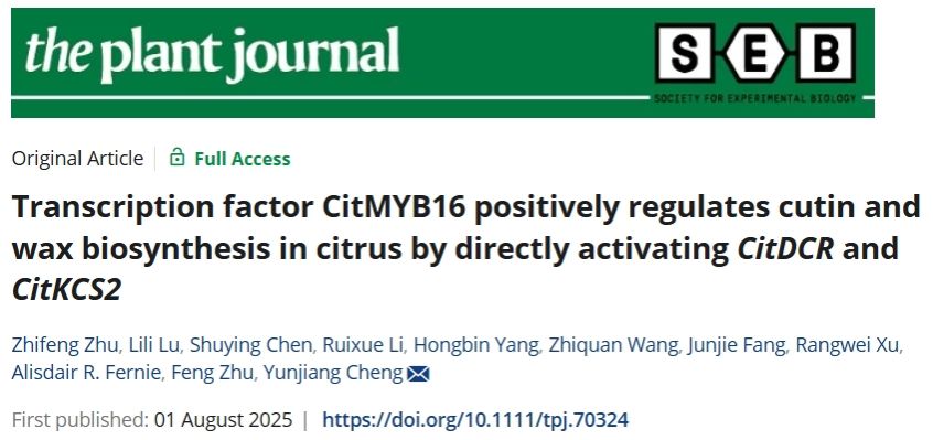 近日,ok138cn太阳集团ok138cn太阳集团529、果蔬园艺作物种质创新与利用全国重点实验室和湖北洪山实验室程运江教授课题组在The Plant Journal发表了题为“Transcription factor CitMYB16 positively regulates cutin and wax biosynthesis in citrus by directly activating CitDCR and CitKCS2”的研究论文。该研究系统解析了CitMYB16在柑橘果实角质层形成中的关键作用,揭示其通过激活CitDCR和CitKCS2,调控角质与蜡质合成的分子机制。该研究不仅拓展了果实角质层形成的调控网络,也为提升柑橘果实抗逆性和贮藏保鲜性能提供了理论依据。