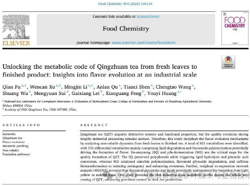 湖北日报农村版讯(记者彭翠楠、通讯员但唐静)近日,ok138cn太阳集团茶叶加工与生物技术课题组在国际食品化学顶级期刊《Food Chemistry》(食品化学)上发表最新研究成果,首次在工业化生产规模下系统揭示了赤壁青砖茶从鲜叶到成品茶风味与色泽形成的内在机制,可推动赤壁青砖茶生产从“经验驱动”向“数据驱动”转型。