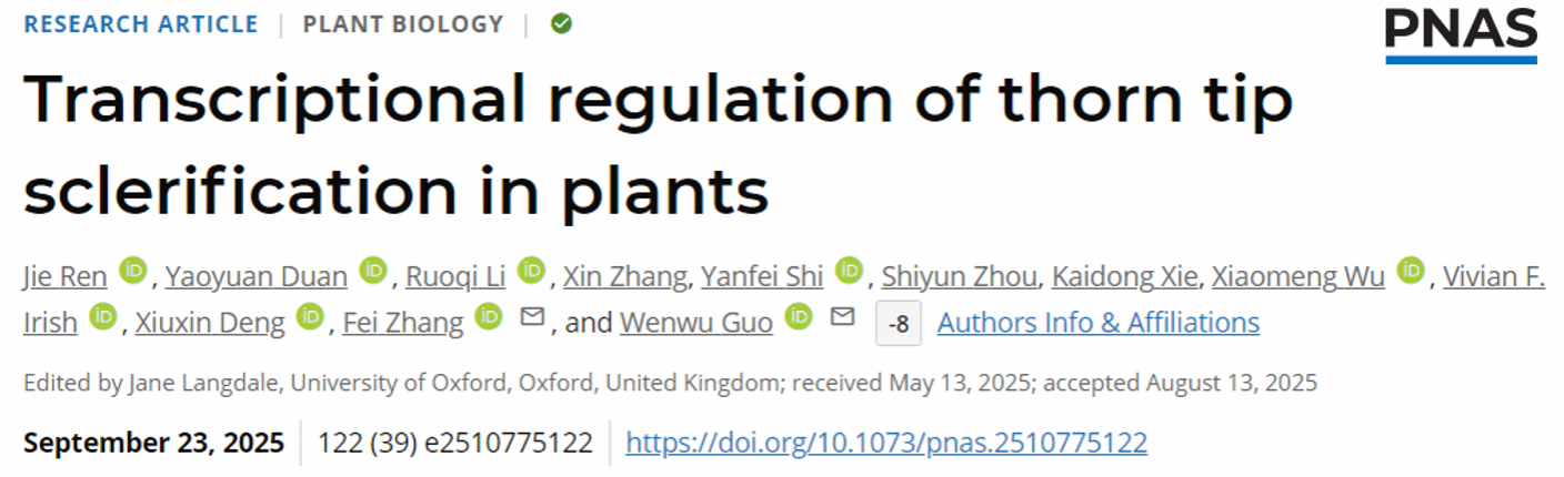 近日,ok138cn太阳集团果蔬园艺作物种质创新与利用全国重点实验室/ok138cn太阳集团529郭文武教授和张飞教授团队在国际著名学术期刊PNAS在线发表题为“Transcriptional regulation of thorn tip sclerification in plants”的研究论文。该研究以柑橘枝刺为模式系统,首次鉴定植物枝刺顶部硬化核心调控基因SHORT AND SOFT THORN 1(SST1),揭示了SST1-NST1/SND1模块促进次生细胞壁增厚、木质素生物合成的调控机制,发现该分子调控在皂荚、三角梅等多种植物枝刺顶部硬化过程中具有保守性,为植物无枝刺分子育种提供了重要基因资源。