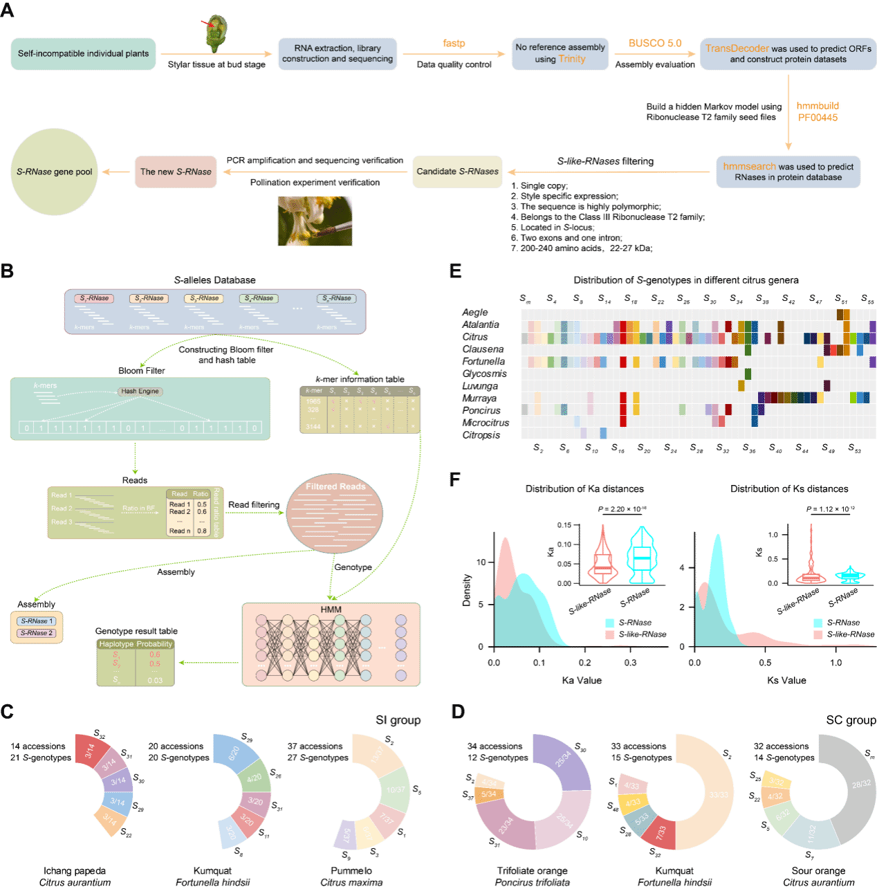 自交不亲和性(Self-Incompatibility, SI)是被子植物进化过程中形成的重要生殖策略,旨在防止自交、促进异交,从而维持物种遗传多样性。柴利军教授课题组前期研究首次证实芸香科柑橘亚科属于以S-RNase介导的配子体自交不亲和系统,控制其自交不亲和系统的雌蕊决定因子为S-RNase(Nature Plants,2020),雄蕊决定因子为SLF (S-Locus F-box)(Journal of Experimental Botany,2024 封面)。并且系统明确柑橘属(Nature Plants,2020;Horticulture Research,2021)、金柑属(Plant Biotechnology Journal,2024 封面)枳属(Plant Communications,2024)资源独特亲和演化机制及下游的复杂调控网络(Plant Physiology,2024)。但有关S位点(S-locus)的表征及演化机制始终还未有明显进展。