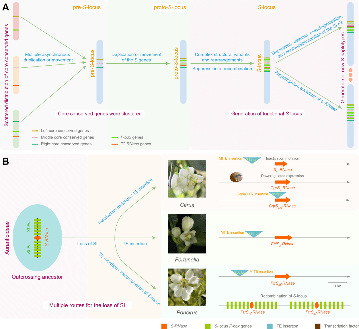 通过比较S位点外群同源序列的核心保守非S基因片段,研究揭示柑橘亚科S位点起源于多次异步复制事件:首先由核心保守非S基因簇组装形成S位点前体(Pre-S-locus);随后通过S基因迁移或复制建立原型S位点(Proto-S-locus);最终经复杂结构变异、重排及重组抑制形成功能性S位点。转座元件在驱动S基因进化中发挥关键作用,其活跃常伴随假基因化事件及自交不亲和性丢失。本研究对柑橘亚科泛S位点的全面解析,为破解自交不亲和系统的复杂性奠定关键基础,并为植物生殖策略的演化机制研究开辟新视角。