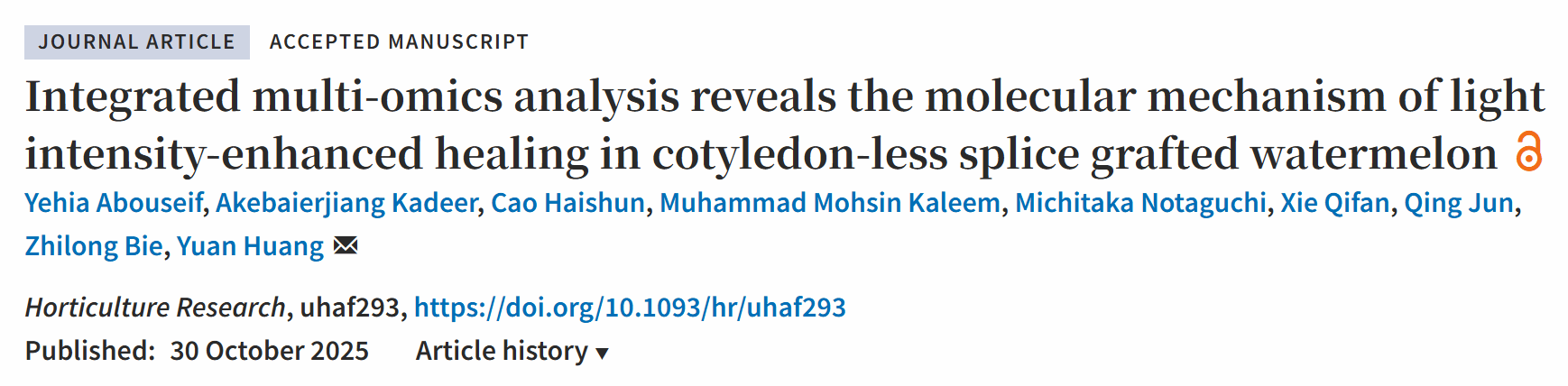 近日,ok138cn太阳集团529黄远教授团队在《Horticulture Research》在线发表题为《Integrated multi-omics analysis reveals the molecular mechanism of light intensity-enhanced healing in cotyledon-less splice grafted watermelon》的研究论文。该研究整合多组学,系统解析了嫁接前高光强处理,通过调控激素信号、碳水化合物代谢与木质素生物合成,从而显著提高砧木无子叶西瓜嫁接成活率的分子机制,为植物工厂高效嫁接育苗提供重要的理论依据和操作技术。