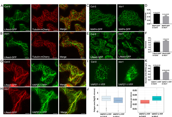 图2. KLCR1、NET3C和IQD2功能缺失突变体的叶片表皮细胞形态与细胞骨架排列发生缺陷