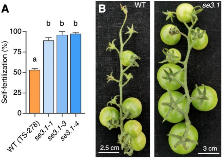 通过GWAS,该研究鉴定到一个与柱头延伸程度显著相关的位点。通过群体变异分析和基因重新注释获得一个编码C2H2类型转录因子的基因SE3.1。SE3.1编码区域一个SNP的差异形成两种等位基因型(SE3.1C和SE3.1T)。在番茄群体中,SE3.1C突变为SE3.1T会导致翻译提前终止,不能形成功能蛋白,进而导致栽培番茄中柱头内缩于花药筒内部。功能互补实验证明SE3.1控制柱头平齐于花药筒顶部与内缩于花药筒内部之间的转变过程,并且柱头延伸程度是在花发育的较早时期决定的。此外,在柱头平齐于花药筒顶部的材料中突变SE3.1后,柱头内缩于花药筒内部,这一转变过程促进了自交率的显著提高。