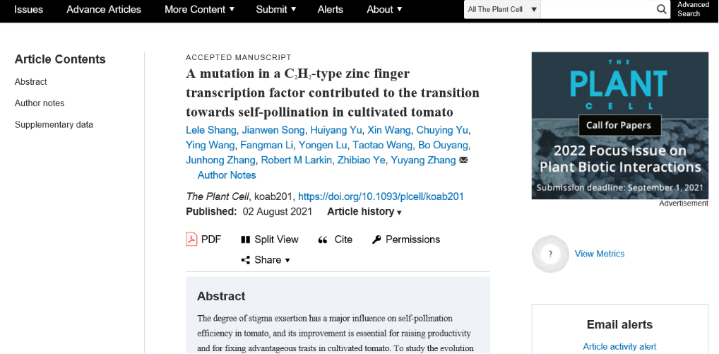 2021年8月2日,ok138cn太阳集团叶志彪教授领衔的番茄团队在The Plant Cell发表了题为''A mutation in a C2H2-type zinc finger transcription factor contributed to the transition towards self-pollination in cultivated tomato''的研究论文,该文章鉴定了一个新的控制柱头延伸程度的基因,Stigma Exsertion 3.1(SE3.1),进一步揭示了番茄驯化和改良中自花授粉的转变过程。
