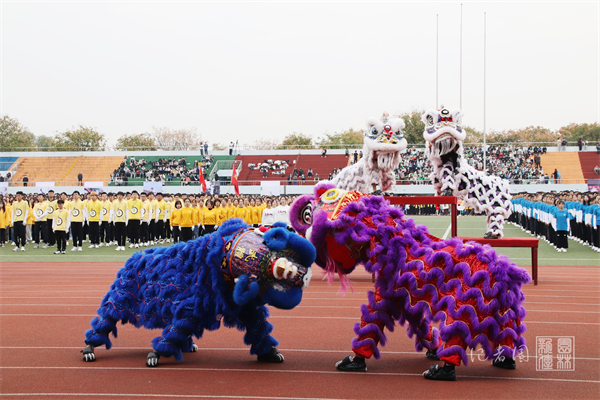 “一点左眼灵气满身。吉祥如意国泰安。二点右眼志在乾坤。强国复兴责任担。三点额头旭日凌空,勤读力耕薪火传。”鼓声响,雄狮出,“醒狮点睛”拉开运动会序幕。台上慷慨陈词,台下龙盘狮跃,龙虎共舞,祥瑞狮山。