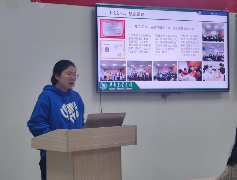接着,2020-2021年度三好研究生孙新媛同学作科研故事分享。她介绍了自己研一阶段担任蔬菜学第二党支部书记的工作经历。“每一次活动的组织筹备都是对我的一次锻炼,从支部工作中我增强了责任意识,同时提升了与人沟通的能力。”孙新媛同志也分享了自己在科研过程中的一些心得。“科研就是不断思考不断尝试的过程,从一次次的失败中我们可以积累经验教训,磨练自己的心态。”