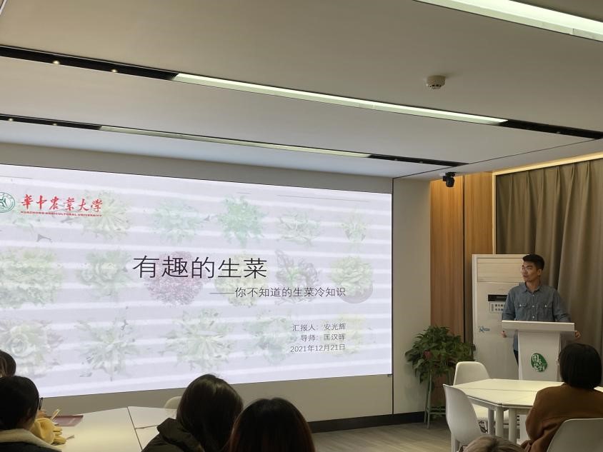 蔬菜系研究生安光辉介绍了自己的博士生日常工作,他以生菜为切入点,通过介绍生菜的相关冷知识,结合多年研究经历与积累的学习经验来鼓舞大家要对研究和学习保持乐观的态度,努力做科研,努力生活,在科研中也不忘发现乐趣。