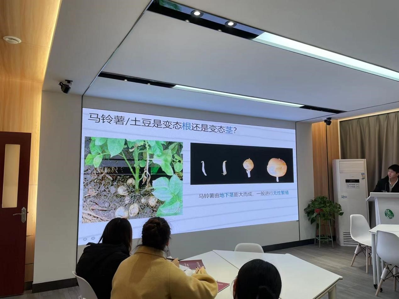 董烈鹏同学通过提问的形式,向大家展现了马铃薯的魅力,同大家分享了令他受益匪浅的文献。他讲到,马铃薯可以和番茄杂交,结出马铃薯,他以视频的形式,展示了马铃薯课题组的日常。一系列生动有趣的讲解,让大家兴趣盎然,深深沉迷于马铃薯的魅力之中。