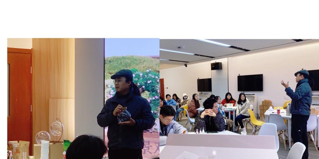 活动伊始,主持人周俣轩介绍了活动内容以及到场嘉宾。随后,秦仁强老师向同学们细致介绍了微景观的设计方法以及园林美学的相关内容。首先,秦老师从创作主题、审美方面进行了介绍,秦老师强调要避免具象思维,如果把自然景观微缩到工艺品的层面上,只关心它像什么,则会忽略它的自然之美,要懂得用现有的材料,做出合适的东西。其次,主题要避免过于具体,创作不要失去自由。第三,从空间方面,竖向发展的空间代表崇高、壮丽与庄重;横向空间是甜美、悠闲、幽静的,表达平顺的关系,平整的美。横竖结合的空间,运用了中国山水画手法。秦老师谈到,欣赏微缩景观时可以移动视觉,就会有“上帝之手”的感觉,在拍照时就需要注重“视觉终端”的效果。