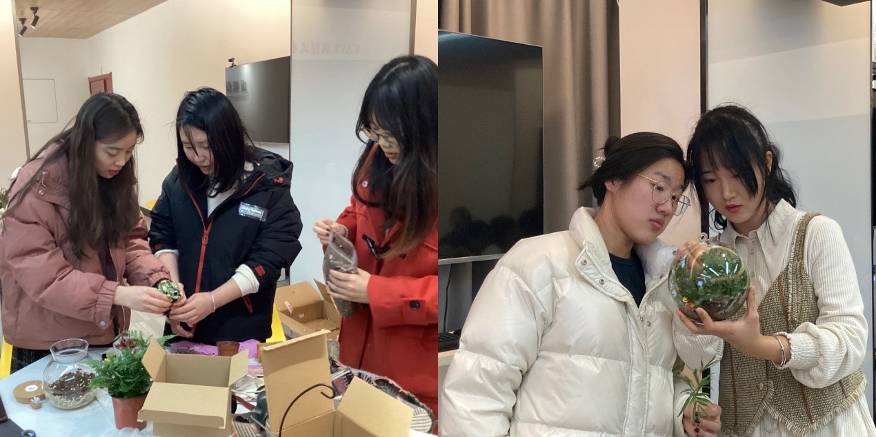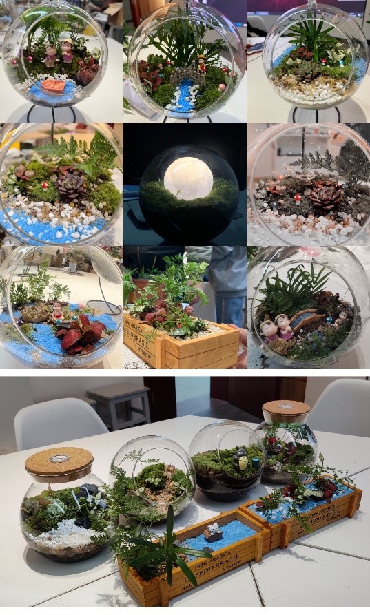 到了设计实践阶段,同学们依据秦老师的讲解和自己的设计理念,细心挑选合适的容器、绿植和配件。以绿植代树,蓝砂代水,运用苔藓、砂石、木条等元素,营造不同的空间意境:有多采用暖色调植物营造温馨花园氛围的作品,有以苔藓和灯光为媒介打造的圆月主题,有以高低错落植物打造出的生态盆景……微景观作品主题各异,妙趣横生。