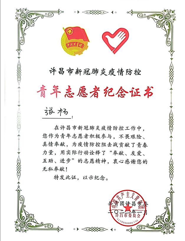 在许昌市疫情防控工作中,张杨作为青年志愿者积极参与、表现突出,共青团许昌市委特发“青年志愿者纪念证书”以作表彰和纪念。