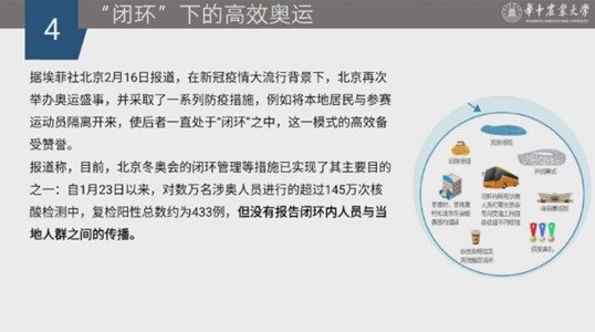 其次,何兴群将我国的防控政策和西方的防控政策进行了比较,得出结论是西方的防控政策不可取,那是对人民生命的蔑视和践踏。她以我国成功举办的“闭环”奥运作为范例,向同学们介绍了我国的疫情防控模式,包括预防为主,专群结合,突出重点等等。