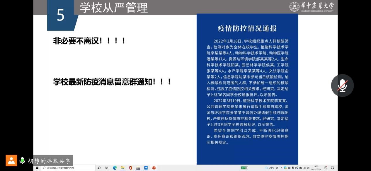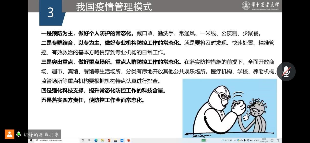 会上,胡静详细介绍了新冠病毒新变异株奥密克戎的相关知识,她表示,虽然奥密克戎致病率低,但传播力快、感染绝对人数大、重症和死亡绝对人数高,且其后遗症多,因此绝不能放松警惕。“我们不能学习西方的与病毒共存策略,”她这样说道,“我国的防控理念是人民至上、生命至上,不会通过被动的免疫来获取人群免疫水平提升。”她提醒同学们要留意群通知,关注学校最新防疫消息,做到“非必要不离汉”。