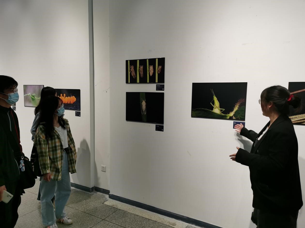 在讲解员闵婧同学生动的讲解下,同学们先后参观了“烛引”“耘耔”、“陟遐”、“彰思”四章节,看到了科研实验中的微观摄影照片、学术科研实践中的纪实照片、“狮言诗语”学科语言三行诗还有各个学院具有学科特色的小型主题展。在参观过程中,一张名为《疑惑》的摄影作品吸引了大家的注意,这张照片拍摄的是一只睡眠被打扰的短额负蝗,它睁着大大的眼睛挠着头,神情姿态十分有趣引得大家发笑。