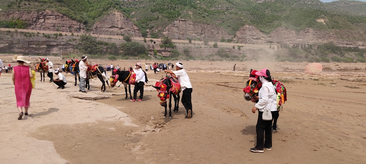 首先,社会实践团成员到达了黄河壶口瀑布景区。受黄河上游降雨影响,黄河壶口瀑布水量大增,形成了延绵超百里的壮美瀑布群景观。伴随着景区播放的《黄河大合唱》的激昂歌声,成员们走近黄河。映入眼帘的首先是壶口毛驴队。他们穿着当地特色服装,头裹羊肚白毛巾,身穿羊皮翻毛背心,紧扎红腰带,成为了黄河壶口瀑布独具特色的景观之一。