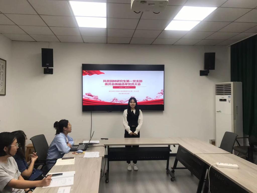 9⽉20⽇,⻛景园林研究⽣第⼀党⽀部于景园楼212举行换届会议,选举产生了新一届党支委。 本次换届会议由支部副书记唐与岑主持,应到党员28名,实到党员25名。