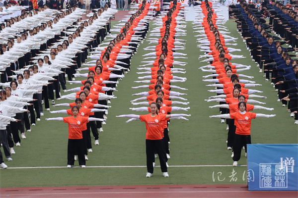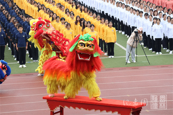 锣鼓声响,“醒狮”现身观礼台,校党委书记高翅、校长李召虎及离退休老教师共同为其点睛。伴着音乐声,醒狮带领舞狮队入场,与观礼台下的师生互动。舞狮过后,广播体操表演开始,各学院同学身着各色院服,从绿茵场中间向两侧迅速散开,随着音乐节拍一同摆臂踢腿,由14个学院1680名学生组成的广播操表演方队充满着蓬勃的朝气,整齐划一的动作令人赏心悦目。