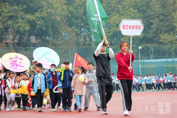 随后,运动员、裁判员入场。各学院、部门及离退休职工代表队喊着召示个性化的口号,手持造型各异的气球及棉花、玉米、稻穗等模型依次走过主席台。入场式结束后,升旗仪式开始。激昂的《义勇军进行曲》声起,全场师生起立,注视着冉冉升起的五星红旗齐唱国歌。在运动员代表、外国语学院外文2208班张芷培同学与裁判员代表李子臣老师先后宣誓过后,青平副校长宣布本届校运会正式开始。