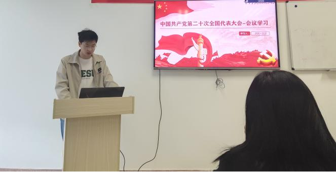 10月23日晚,党支部于园林南楼421开展主题党日活动,本次活动主要学习习近平总书记在中国共产党第二十次全国代表大会上的报告,会议由李帅同志主持。