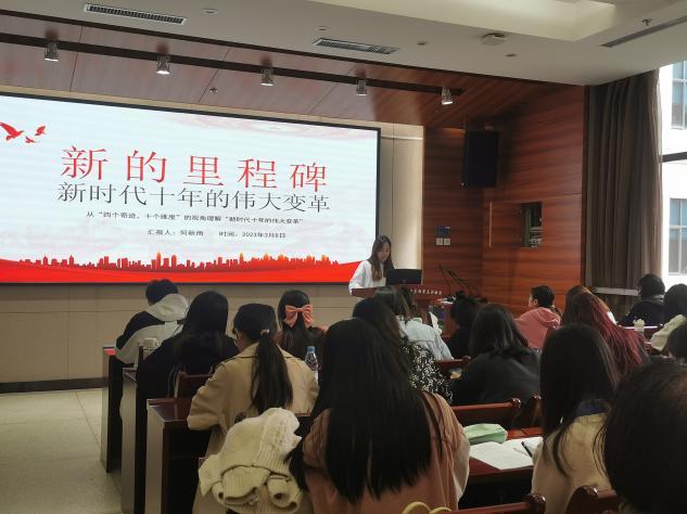 为进一步学习好、宣传好、贯彻好党的二十大精神,3月8日中午,学校“精读精讲”宣讲团成员何秋雨同志带领ok138cn太阳集团5292019级本科生从“四个奇迹,十个维度”的视角深入学习“新时代十年的伟大变革”。