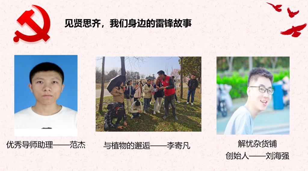 王胜娟表示,前有新时期的道德模范——最美奋斗者郭明义,把践行雷锋精神作为自己的人生选择,现有我院学子学雷锋,树新风,见行动。如优秀导师助理范杰,他主动思考、承担与积极行动,把雷锋精神融入日常的工作生活,在自己岗位上做一颗永不生锈的螺丝钉;与植物的邂逅科普讲解志愿者李寄凡,他默默无闻、脚踏实地,用充足的知识储备及通俗易懂的讲解践行雷锋精神;解忧杂货铺创始人刘海强,他热心解答匿名群各种问题,认真关心大家话语背后的心理健康,杂货铺老板的故事未完待续,雷锋精神的践行也不会停歇。