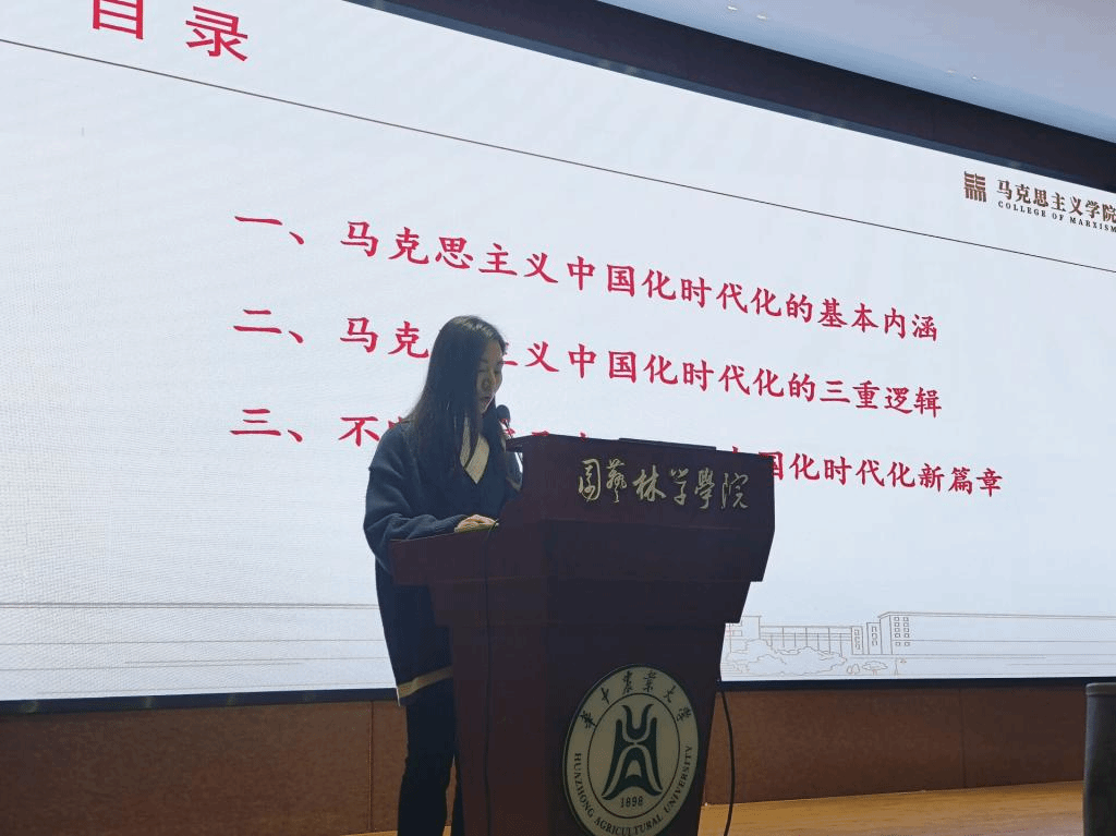 为进一步学习贯彻党的二十大精神,4月6日,研究生“精读精讲”宣讲团成员、马克思主义学院张洁同志于园林北楼228开展了以“持续推进马克思主义中国化时代化”为主题的党的二十大宣讲。