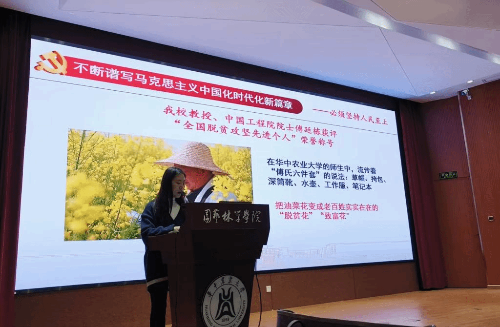 在“不断谱写马克思主义中国化时代化”新篇章这一部分,张洁同志谈到:“青年强,则国家强,我们当代青年生逢其时,更要坚定不移听党话、跟党走,立志做新时代好青年。”并以把油菜花变成老百姓实实在在的“脱贫花“”致富花“的傅廷栋院士;践行“把中国人的饭碗牢牢端在自己手中”的欧阳亦聃教授;怀揣航天报国之梦,被誉为发射场的“金手指”的校友廖国瑞的先进事迹,勉励同志们踔厉奋发,砥砺前行。