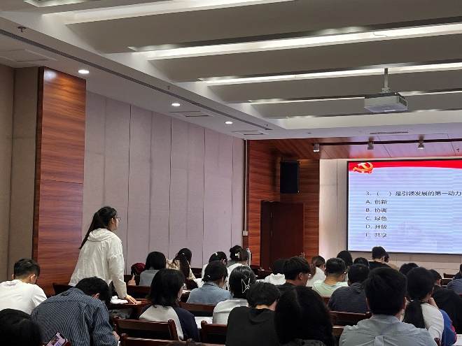 本周理论学习的最后环节主要围绕新发展理念和“两山”理念的内容,采用知识竞答方式开展,党建办将最新一期的《求是》杂志作为奖品发放给同学们。