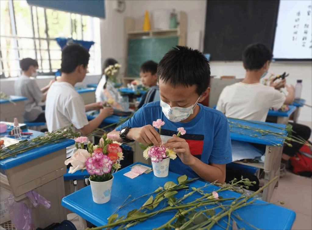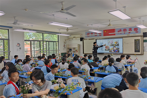 科普活动后,志愿者们为同学们分发花材,开展了纸杯插花的体验活动,带其深入理解中国花卉与鲜切花产业的关系。志愿者一边指导同学们完成自己的作品,一边向同学们介绍花材的产地信息,不一会儿,一个个丰富多彩、富有春意的插花作品就相继诞生。在插花过程中,志愿者引导同学们不用拘泥于范例的样子,依据自己的想法和创意,创作属于自己的花艺作品,不少同学都开心地拿着自己的纸杯,向志愿者们分享灵光一现的趣味想法。借助“红领巾小创客”插花体验活动,以花艺为载体,本次活动锻炼了同学们的创新精神和实践能力。