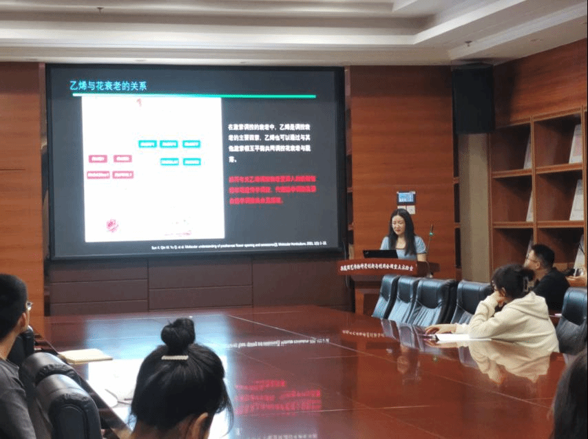 冯珊介绍了衰老在整个植物的发育过程中的重要性,她谈到,衰老是一个非常活跃、高度有序和调控良好的发育过程,对植物的生殖适应性也至关重要。冯珊讲到,鲜切花在采后流通过程中,常常面临巨大的损耗,研究鲜切花衰老可以延长鲜切花瓶插期,瓶插期的延长可以大大提高鲜切花的经济价值,研究花衰老对于农作物的结实率和农作物的观赏价值也有着一定意义。