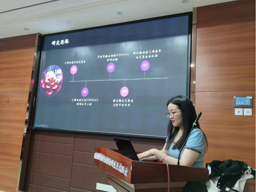 接下来,冯珊阐述了花衰老的分子机理。她指出,过去的研究明确乙烯是激素调控衰老的主要因素,乙烯不仅能单独调控衰老,也能与其他激素相互平衡共同调控花衰老与脱落。紧接着,冯珊还向同学们介绍了组蛋白修饰与转录调控之间的关系、修饰的类型以及被修饰的氨基酸种类。冯珊将康乃馨中对乙烯最敏感的品种——马斯特作为研究对象,研究检测发现组蛋白H3K4三甲基修饰水平无论是在康乃馨自然衰老还是在乙烯诱导衰老过程中都显著上升,这说明了H3K4me3确实与花衰老存在关系。通过进一步研究可以发现组蛋白H3K4甲基转移酶DcATX1能够延缓花衰老, DcATX1可以促进靶基因启动子区域H3K4me3的修饰水平。活动最后冯珊老师鼓励大家道:“希望每个人都能够在自己的领域里找到快乐,找到价值,找到意义,期待大家都能闪闪发光。”