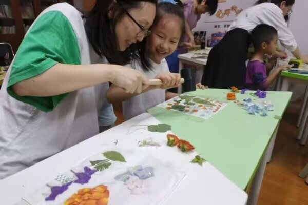 下午四点半,此次植物拓印活动顺利结束,小朋友们拿着自己的拓印作品与志愿者合影留念。志愿者何欣欣总结道:“小朋友们真是赋有极强的想象力与创造力,他们对植物拓印的热情激励着我们将非遗拓印的科普课堂持续推动、深化下去。”