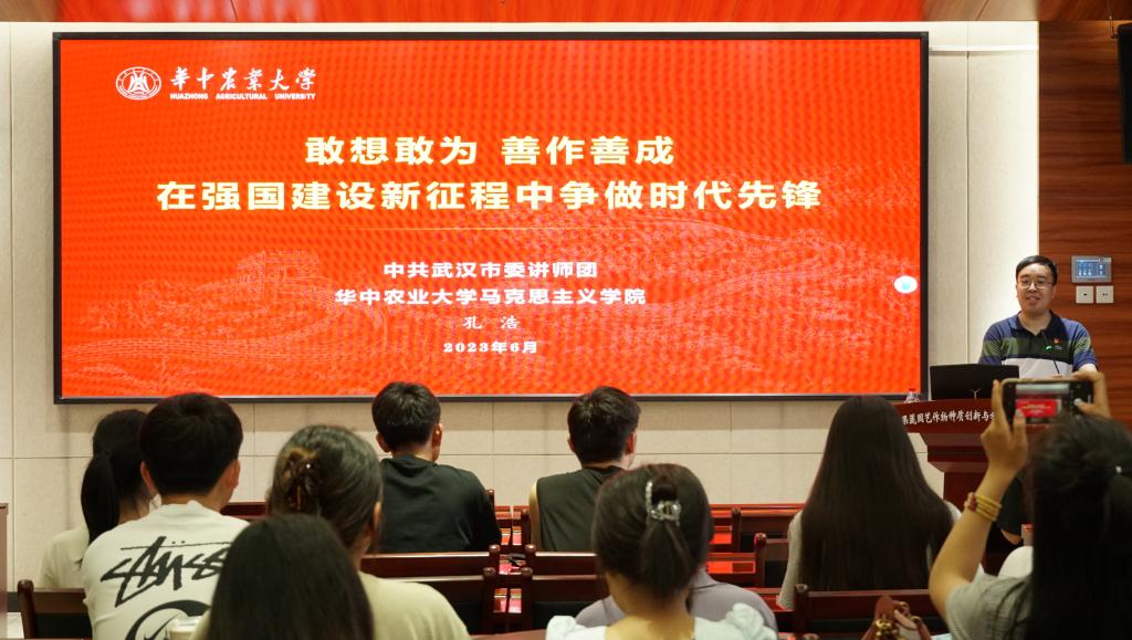 在谈及习近平总书记的“青年观”时,孔浩谈到,青年兴则国家兴,青年强则国家强,纵观百年党史,每个时代都有英雄的青年挺身而出,以不朽的灵魂铸就民族的脊梁。孔浩指出,新青年筑梦新时代,新时代成就新青年,广大青年要牢记习近平总书记的嘱托,坚定不移听党话、跟党走,以实现中华民族伟大复兴为己任,立志做有理想、敢担当、能吃苦、肯奋斗的新时代好青年,要脚踏实地,胸怀天下,发挥专业特长,积极投身乡村建设,为乡村振兴贡献华农学子的力量。