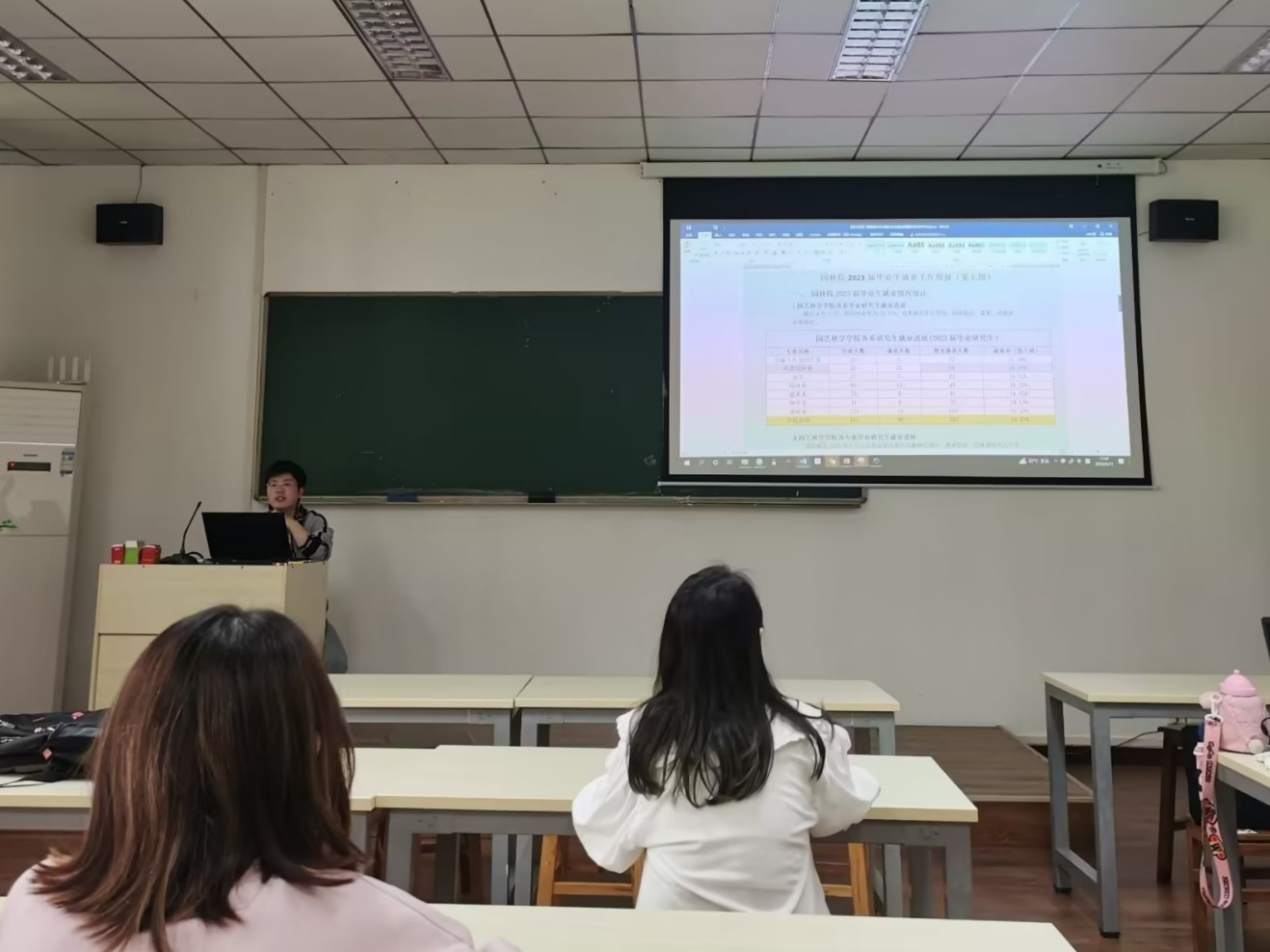 孙长虹首先介绍了班会的目的,围绕“如何应对目前的就业形势、如何规划自身研究生阶段、如何提升未来职业竞争力”三个方面分别进行了阐述,并以本科同学的相关工作经历向大家分享经验,提高班级同学的就业信心。结合院2023届毕业生第七周就业情况的统计报告,孙长虹说道:“要通过多渠道关注就业信息,积极向工作室的师兄师姐或者已经工作的同学寻求相关建议和经验。”