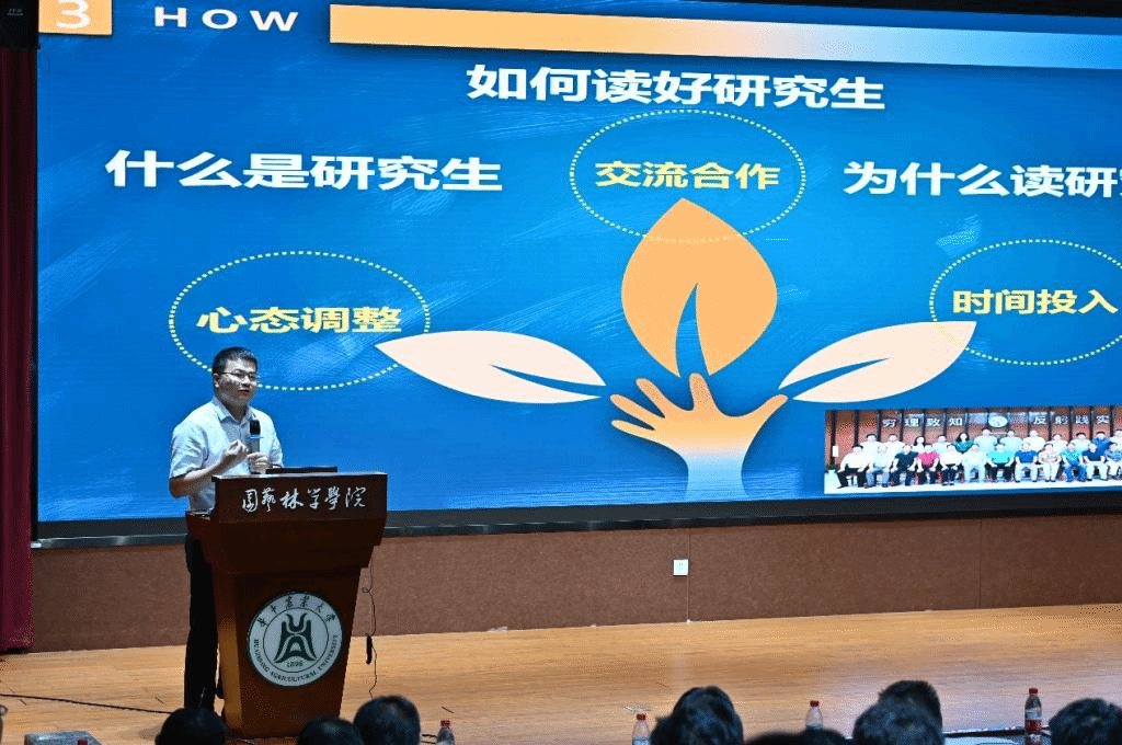 果树系青年教师朱峰老师从“什么是研究生”和“我为什么读研究生”等问题,逐渐聚焦到提升研究生的认知论和方法论。他认为,研究生需要明确本科生和研究生的差别,从知识的吸收者向创作者的转变。此外,他引用了北宋学者张载的“横渠四句”和邓院士的“顺境助产量,逆境促品质”,鼓励新生要有坚持不懈的努力和积极应对挑战的勇气,培养扎实的专业知识和创新思维能力,以迎接科研生活。