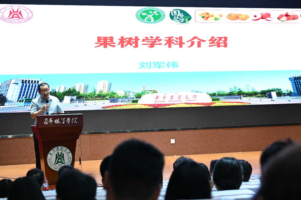 果树系主任刘军伟为新生们介绍了果树系悠久历史、强大的师资力量和丰硕成果。接着,他介绍了果树系主要研究的五个树种在种质资源发掘与利用、细胞工程遗传改良、基因组学、栽培生理与品质调控、采后生物学和康养园艺等方向取得的重要成果。最后他指出,青年人应勇于担当起国家的任务、人类的任务,希望果树系新生能够使用好平台力量。