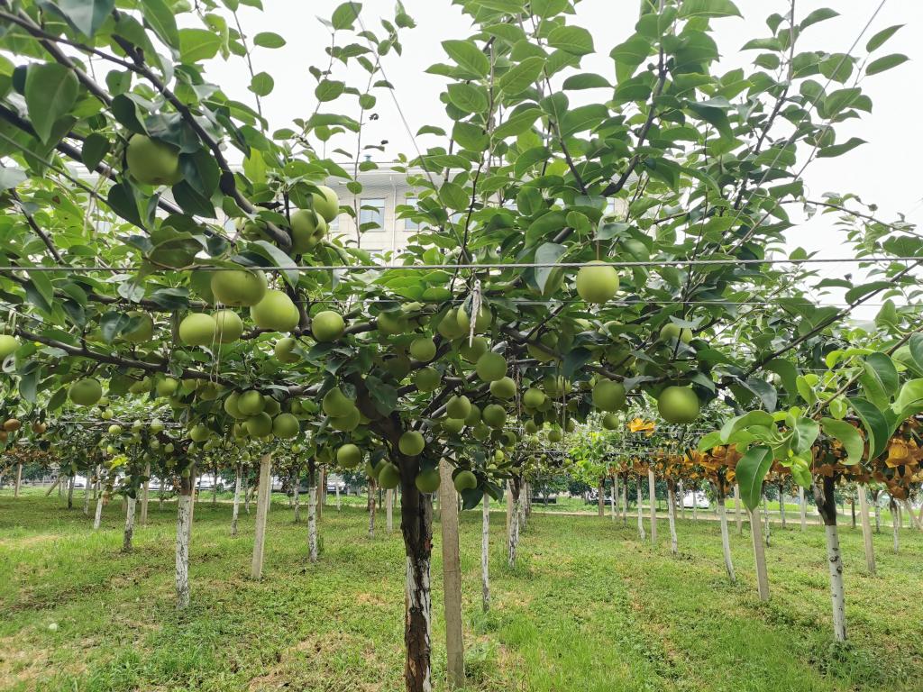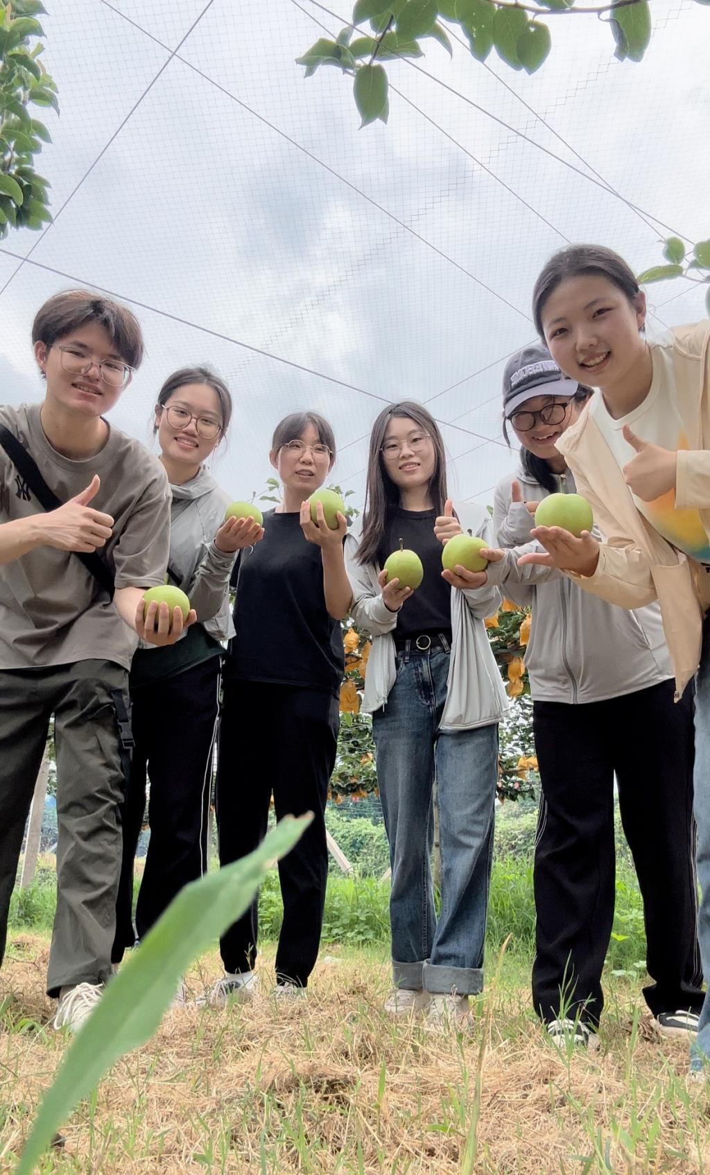 为更加深入了解“双臂顺行式”梨栽培模式的研发与应用,实践小队一行人又驱车前往果茶所江夏基地梨科技示范园,在这里,实践小队参观了“双臂顺行式”棚架梨各个研发时期的架式与应用,并在产区管理员的带领下,参与了梨果采收、拉枝等生产活动。