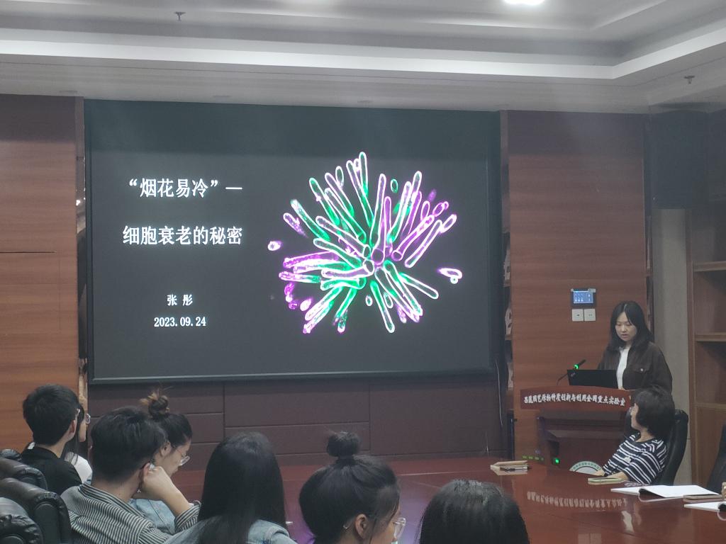 第二位分享者张彤以“‘烟花易冷’—浅谈自噬与花器官衰老的联系”为题展开报告,其报告的主要内容为:开花植物特有的胞吐复合体成员Exo84c,通过与内质网定位蛋白VAP27相互作用,参与植物柱头衰老过程。再对衰老过程中柱头乳突细胞进行活细胞成像观察,发现乳突细胞衰老过程中Exo84cVAP27通过自噬途径进入液泡内降解;同时,Exo84cVAP27的互作还介导胞吐复合体及其成员通过选择性自噬途径降解,影响柱头细胞的活性及有效授粉期。由此,研究不仅揭示了自噬途径在花器官衰老过程中的作用,也为通过延长有效授粉窗口进一步保证产量提供了理论依据。