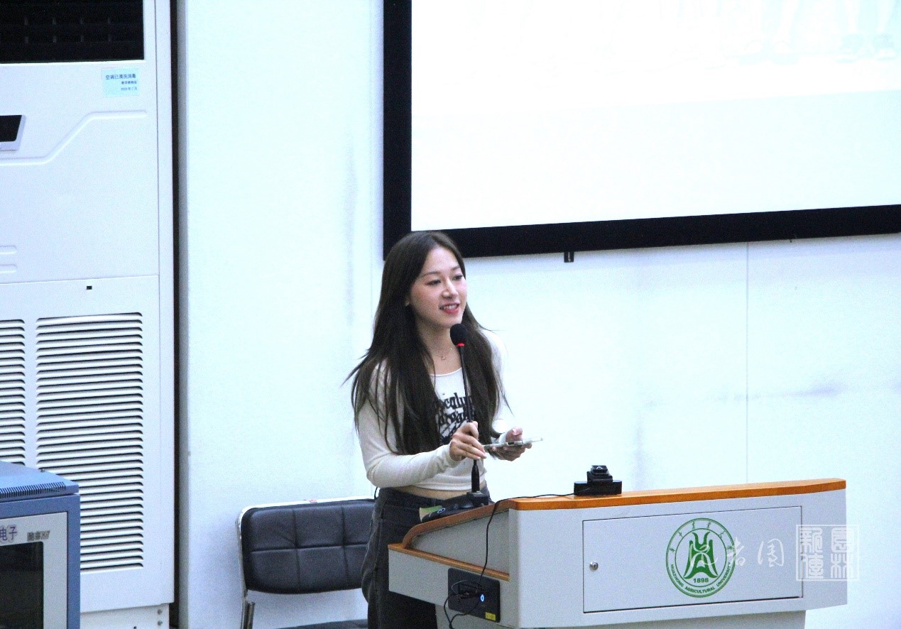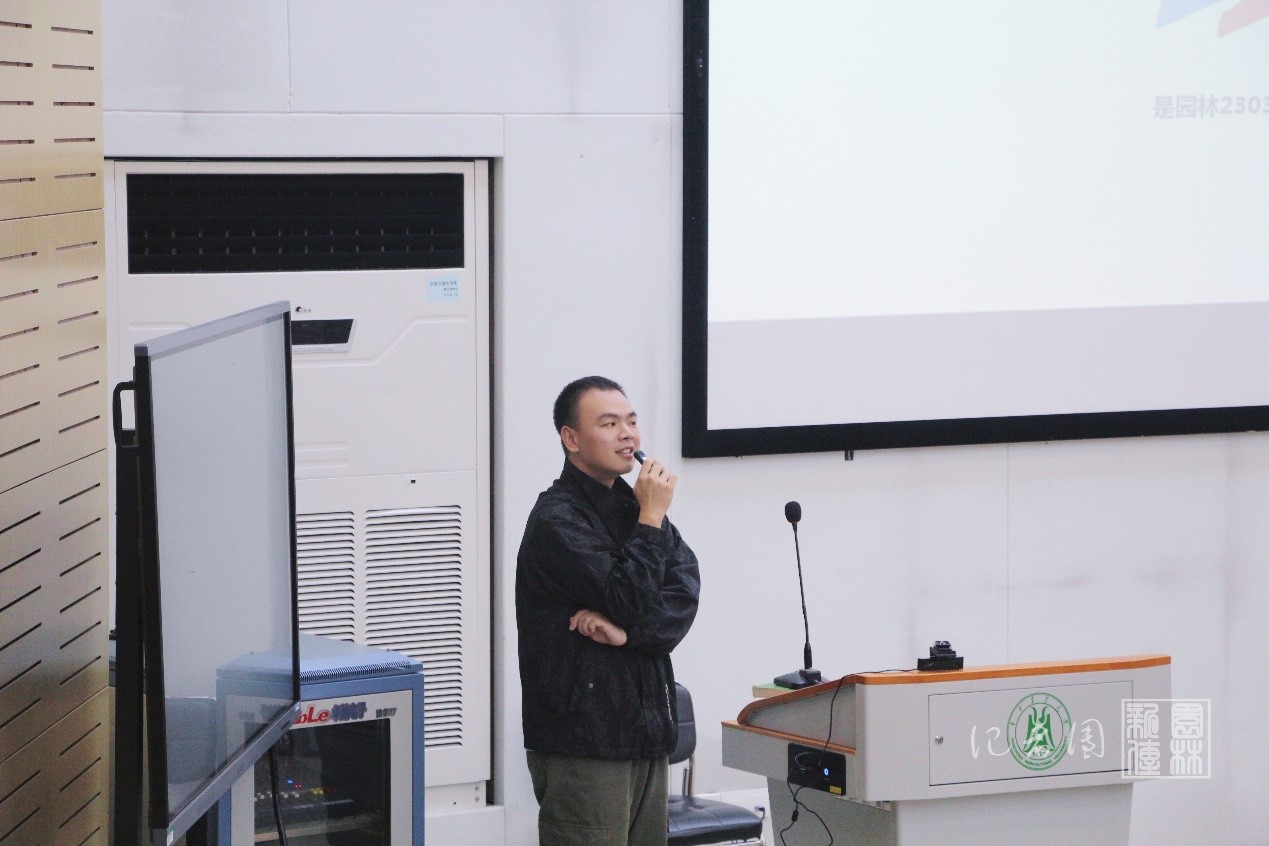 会议接近尾声,院球队的成员上台为同学们进行介绍。园林2003班的黄懿围绕排球队讲述了另类打破信息差的故事。学生会主席团成员张悦和大家分享了园林篮球、足球、羽毛球等各种体育赛事及我院曾获奖项。此外,张悦也向全体同学发出邀请,她说:“生命不息,运动不止,我们欢迎各位对运动感兴趣的同学加入我们各个球队,为学院而战,为球队而战。”