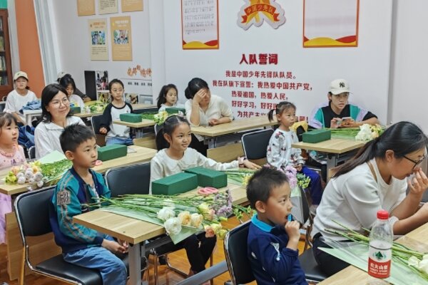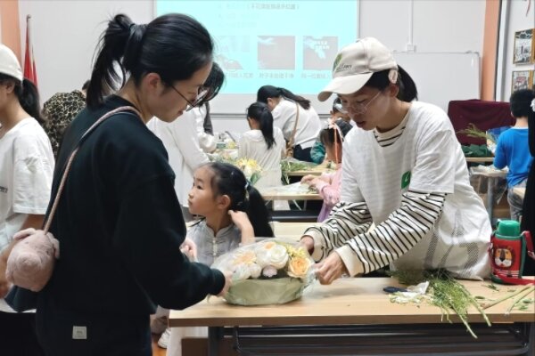 下午四点半,活动进入尾声,小朋友们捧着自己的插花作品与志愿者合影留念。志愿者何欣欣总结道:“这次活动的小朋友和家长的参与度都非常高,说明我们服务队自然科普实践类的活动形式得到了他们的认可。今后,我们将持续挖掘更丰富的科普内容与活动形式,带来更加生动的志愿服务与活动体验。”